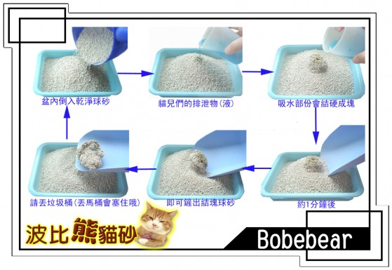 【使用方法】取一乾淨單層貓砂盆 平舖上5公分的球砂 待喵兒們如廁後 球砂遇水部份30~60秒會結硬塊 用貓砂鏟將砂塊鏟出丟入垃圾桶 再補充一些新砂待下次如廁.